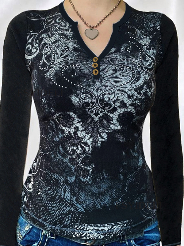 Gothic Print V Neck Long Sleeve Tee