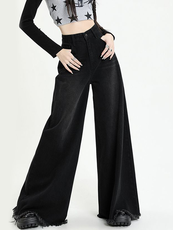 Versatile Black Raw Edge Wide Leg Boyfriend Jeans