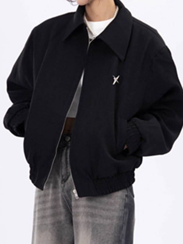 Vintage Solid Star Badge Lapel Neck Zip Up Jacket