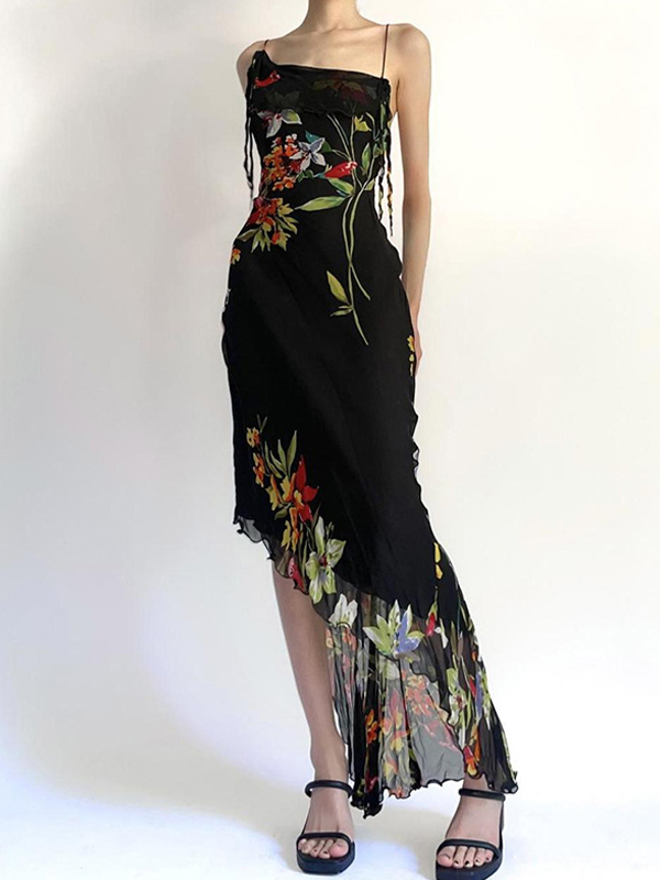 Floral Irregular Pleated Mesh Maxi Dress
