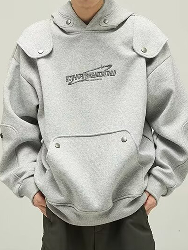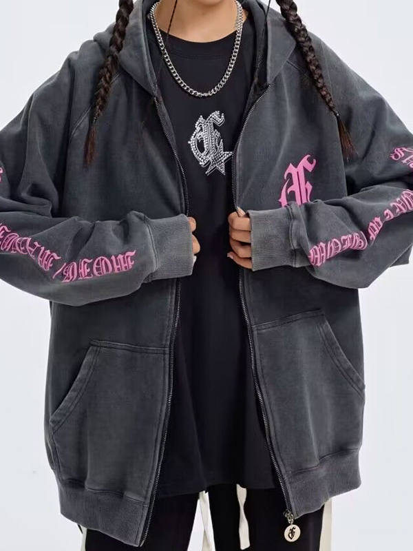 Distressed Contrast Color Embroidered Zip Up Oversized Hoodie