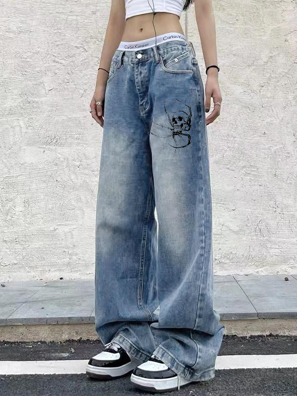 Skull Print Vintage Blue Wide Leg Boyfriend Jeans