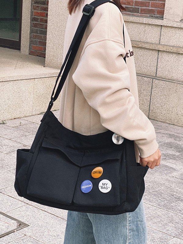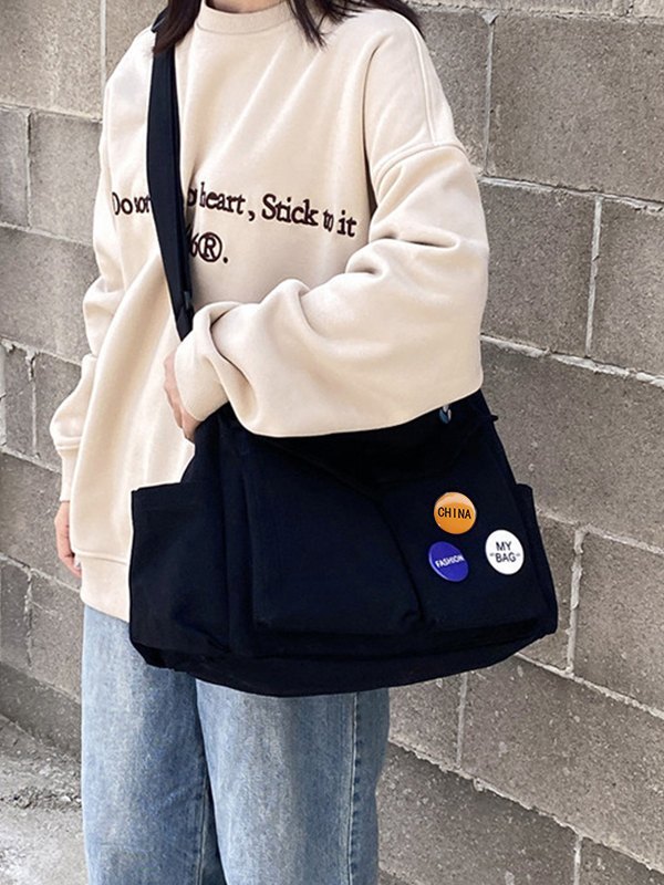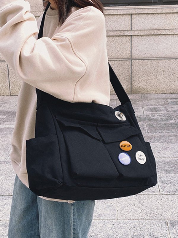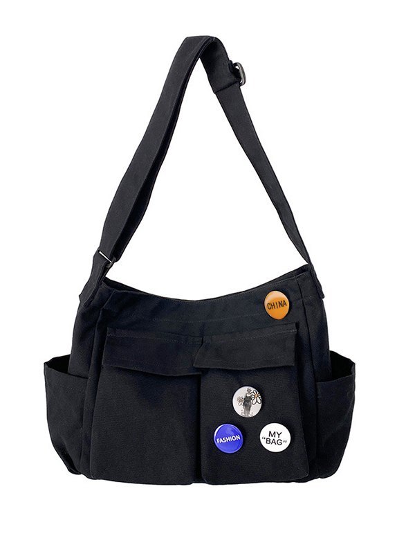 Details: Features an adjustable shoulder strap, with multi badge pendants, inner pockets and zip fly design.