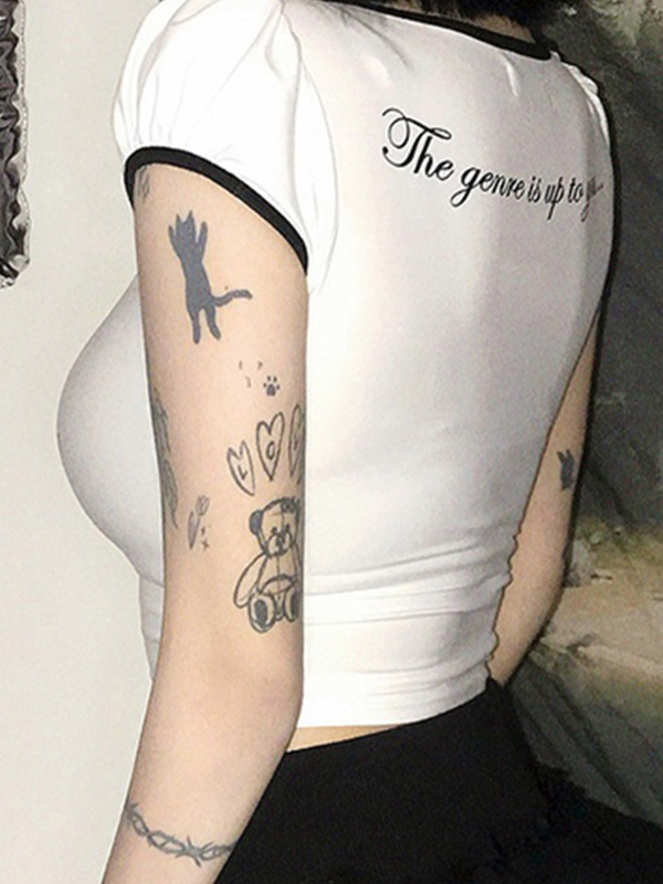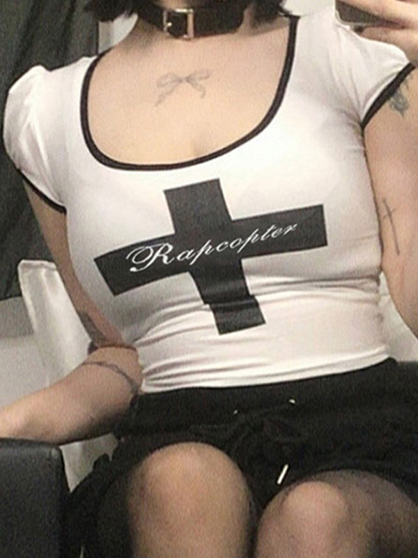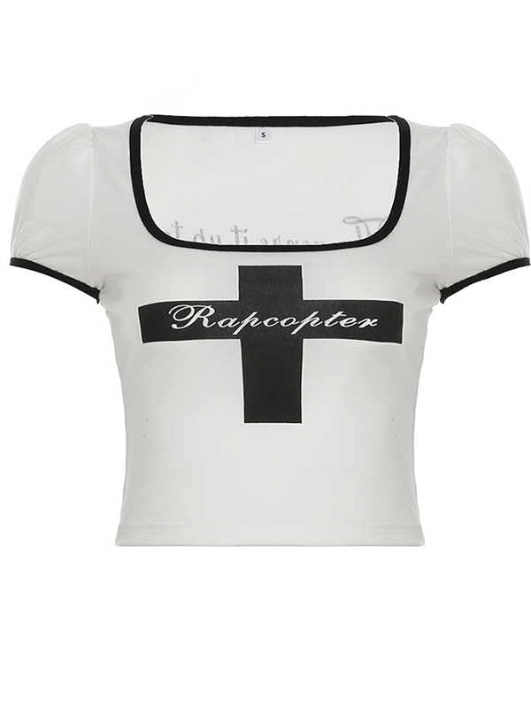 Cross Letter Printed Bubble Sleeve Short Sleeve Tee