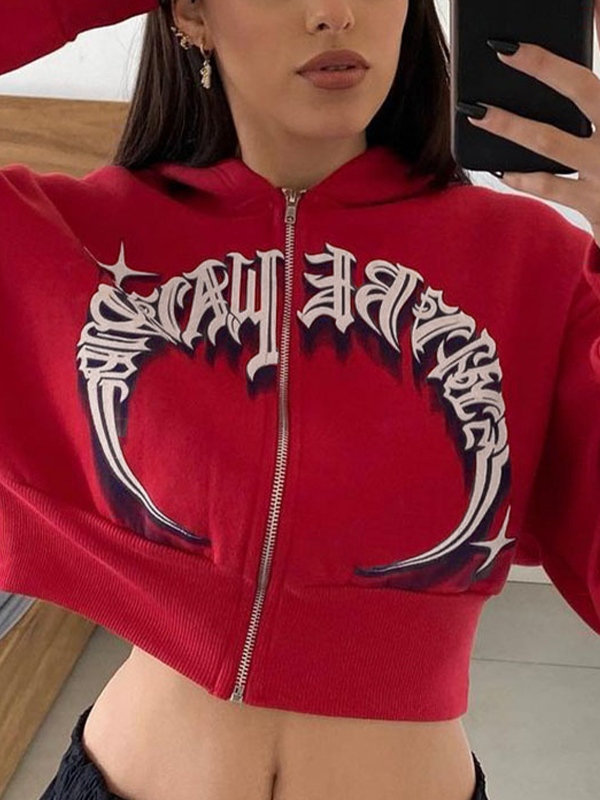 Gothic Print Zip Up Cropped Oversized Hoodie
