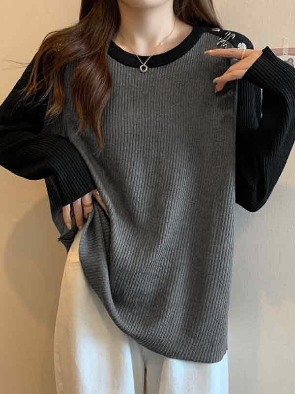 Contrast Color Splice Metal Decor Long Sleeve Knit